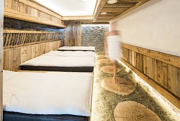 Unser Pool hat angenehme 30 °C und ist 25 Meter lang: Zur Hälfte liegt das Becken drinnen und zur Hälfte draußen. Sie können gemütlich Ihre Bahnen ziehen – im Winter dampft das warme Wasser herrlich, sobald man den Außenbereich nutzt. Und im Sommer lässt sich draußen angenehm gekühlt die Sonne genießen. Im 35 °C warmen Relax-Pool können Sie sich richtig durchwhirlen lassen und spüren, wie sich Verspannungen langsam lösen.